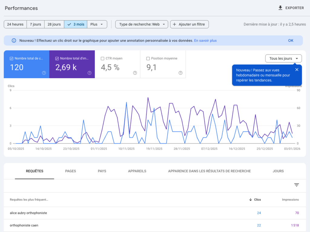 L’agence Sift Studio accompagne les professionnels de santé dans le développement de leur visibilité locale. Récemment, nous avons eu le plaisir de travailler sur le lancement d’activité d’une orthophoniste à Caen, avec des résultats particulièrement encourageants dès le premier mois.